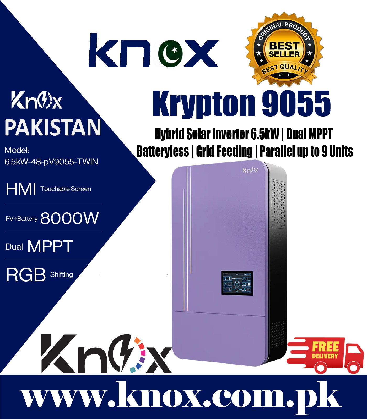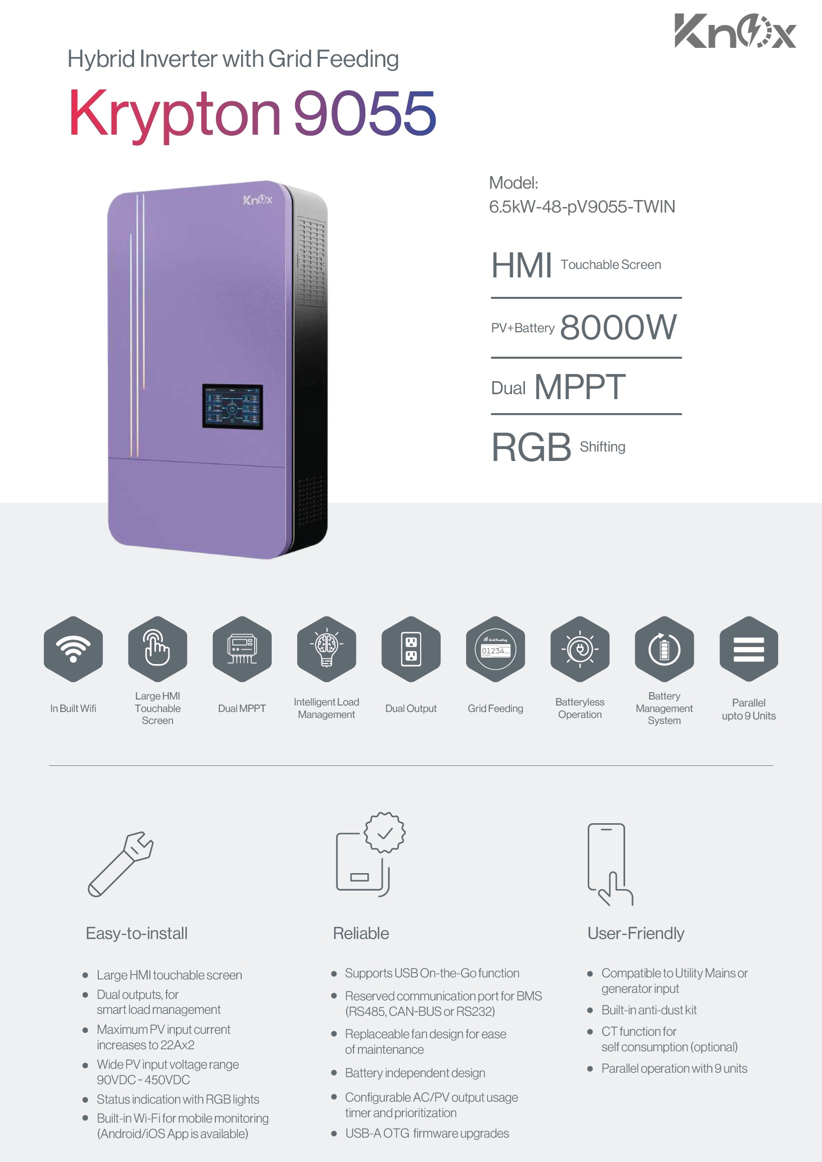 Knox Krypton 9055 hybrid inverter with dual MPPT, batteryless operation, grid feeding, built-in WiFi, 7” HMI screen & parallel up to 9 units. with 3 Years Warranty