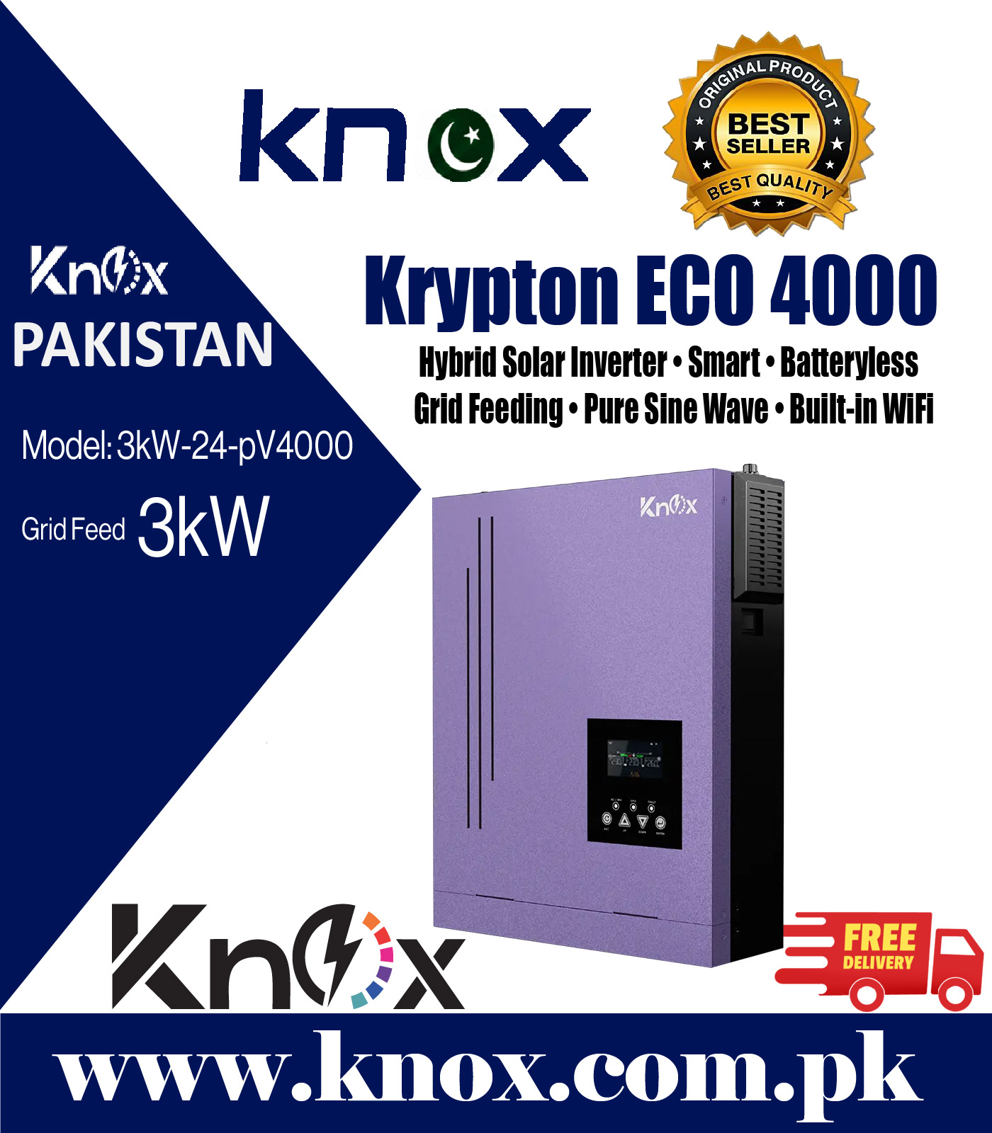 Knox Krypton Eco 4000 Hybrid Solar Inverter | Smart Batteryless Grid Feeding | Pure Sine Wave | WiFi Enabled