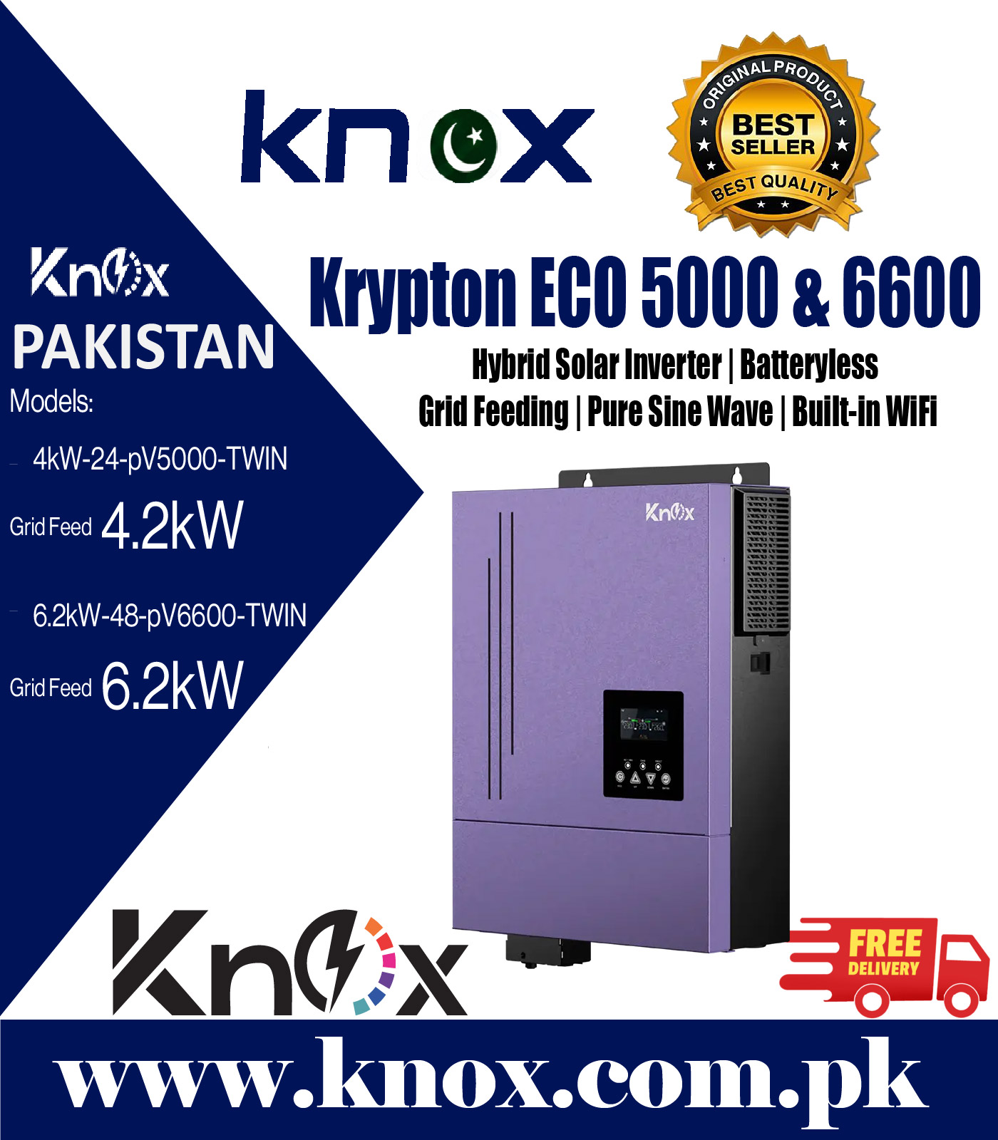 ₨ 112,999 – ₨ 120,999Price range: ₨ 112,999 through ₨ 120,999Knox Krypton 9055 Hybrid Solar Inverter 6.5kW | Dual MPPT | Batteryless | Grid Feeding | WiFi Monitoring | 3 Years Warranty