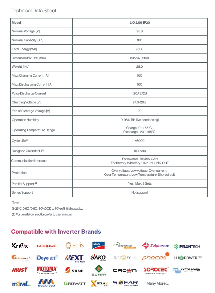Category Specification Brand Knox Series Powerwall Model LIO 2.66-IP20 Battery Type Lithium-ion (LiFePO4) Cell Type REPT Prismatic Cells Nominal Voltage 25.6V Nominal Capacity 100Ah Total Energy 2.56kWh (2560Wh) Usable Energy ≥ 95% Max Charging Current 100A Max Discharging Current 100A Peak Discharge Current 120A (2 seconds) Charging Voltage Range 27.6V – 28.8V End of Discharge Voltage 22V Cycle Life > 6000 cycles Design Life 10 Years Battery Management System PACE Intelligent BMS Parallel Expansion Up to 8 Units Series Connection Not Supported Communication Ports RS485, CAN Display 4.3” Touch LCD Protection Level IP20 Mounting Type Wall-Mounted Operating Temperature (Charge) 0°C to +55°C Operating Temperature (Discharge) –20°C to +55°C Humidity Range 0–95% (Non-Condensing) Dimensions (W × D × H) 395 × 470 × 160 mm Weight 28 kg Warranty 5 Years Certifications IEC62619, UL1973, UL9540A, CE, ROHS, UN38.3, MSDS 🧪 Performance & Lifetime