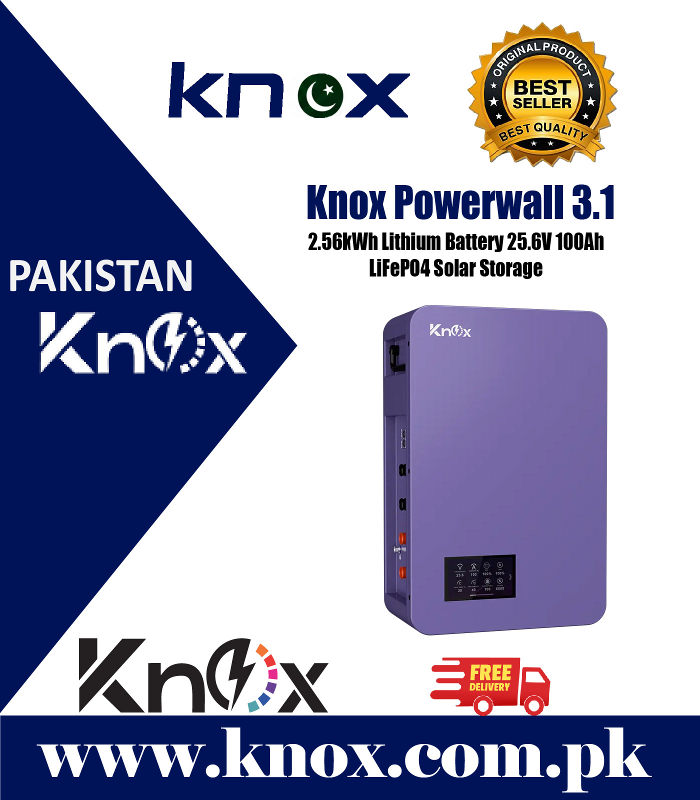 Knox Powerwall 3.1 lithium battery 25.6V 100Ah with LiFePO4 cells, 6000+ cycles, smart BMS, inverter compatible, ideal for solar energy storage.