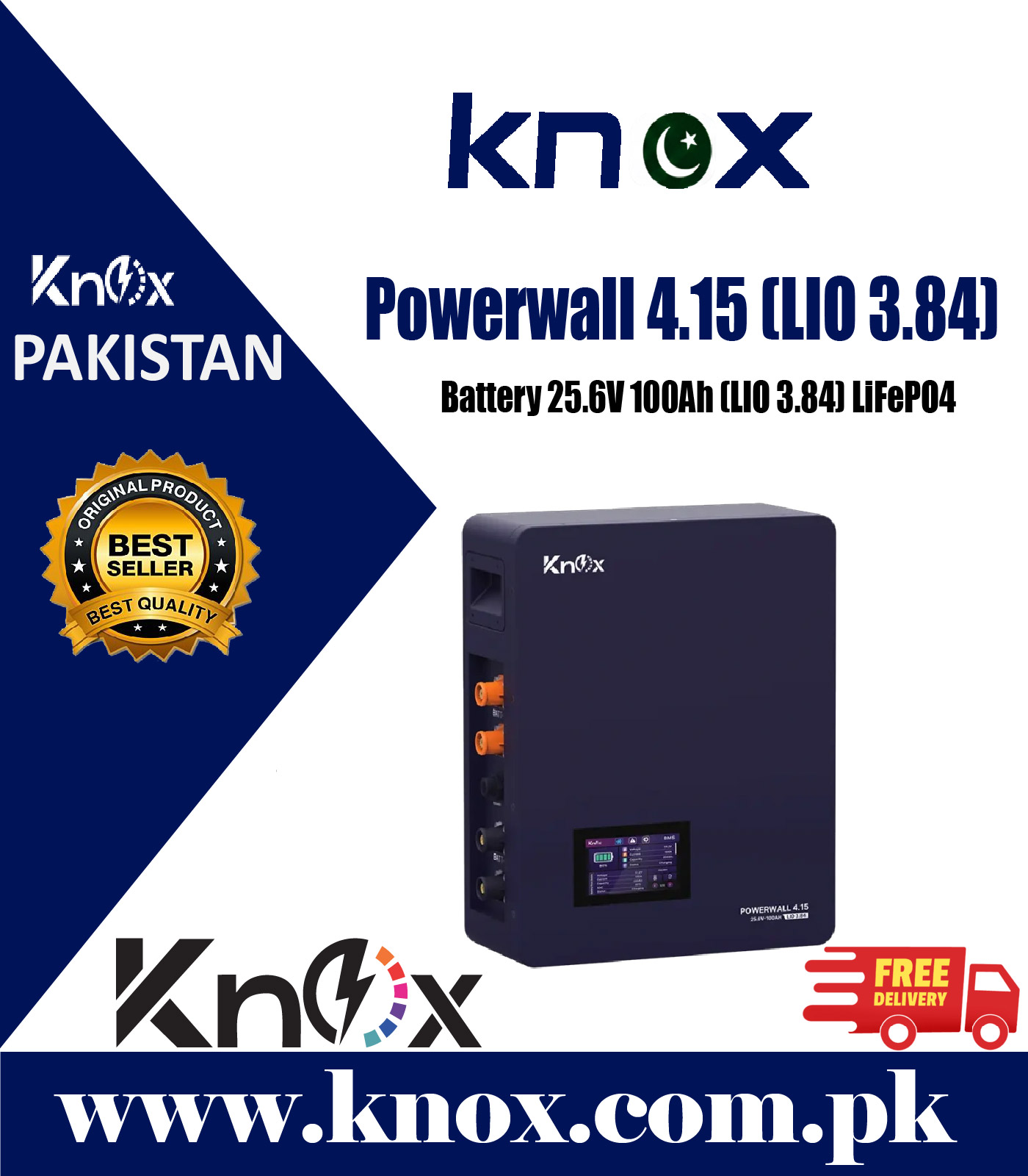 Knox Powerwall 4.15 Lithium Battery (LIO 3.84) 25.6V 100Ah LiFePO4 lithium battery with 6000+ cycles, smart BMS, touchscreen display, and IP54 protection. Ideal for solar & backup power.