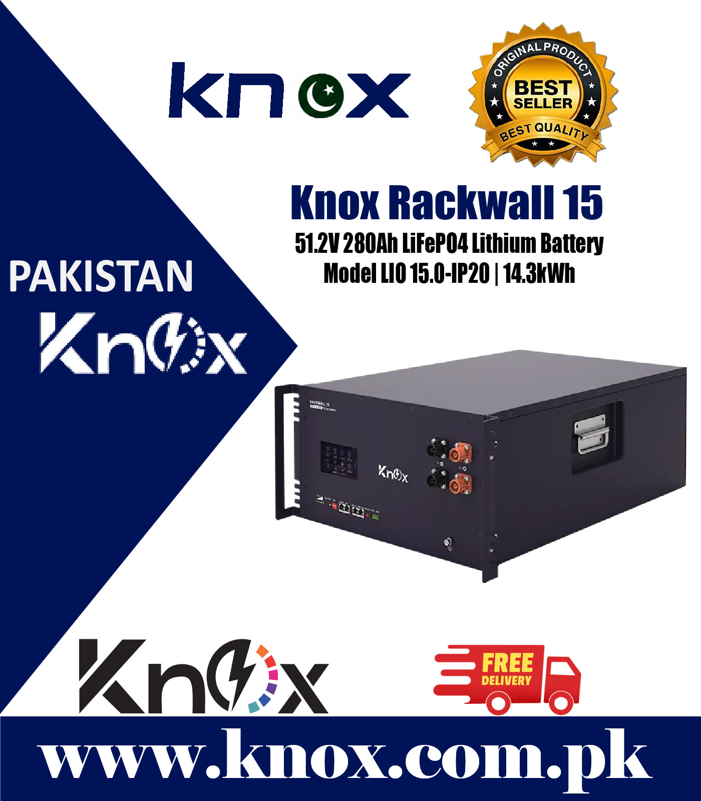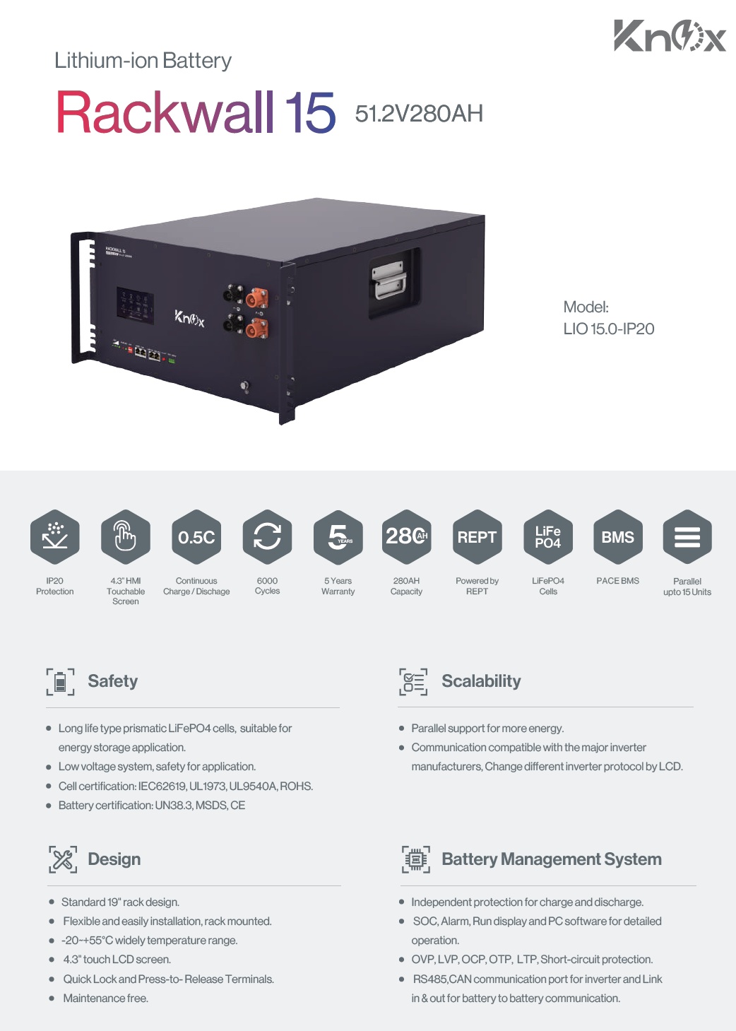 Knox Rackwall 15 51.2V 280Ah LiFePO4 Lithium Battery – Model LIO 15.0-IP20 | 14.3kWh