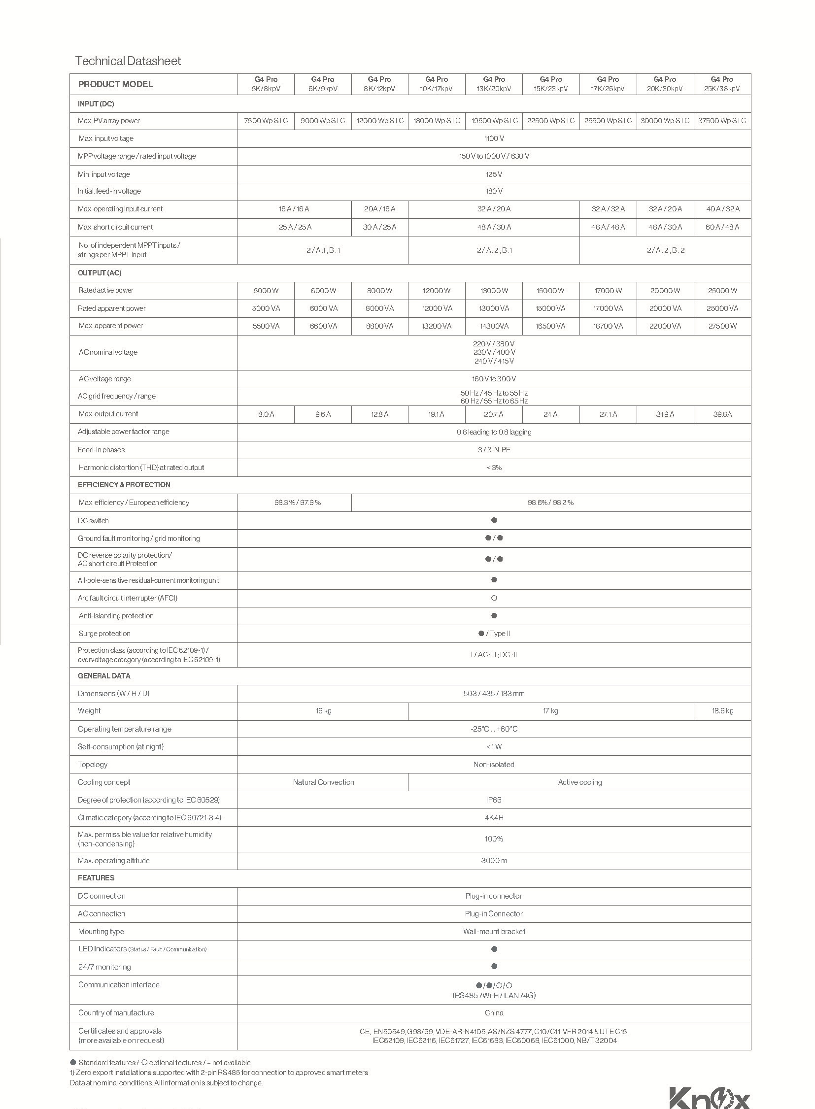 | Model | G4 Pro 5K / 8kPV, G4 Pro 6K / 9kPV, G4 Pro 8K / 12kPV, G4 Pro 10K / 17kPV, G4 Pro 13K / 20kPV, G4 Pro 15K / 23kPV, G4 Pro 17K / 26kPV, G4 Pro 20K / 30kPV, G4 Pro 25K / 38kPV |