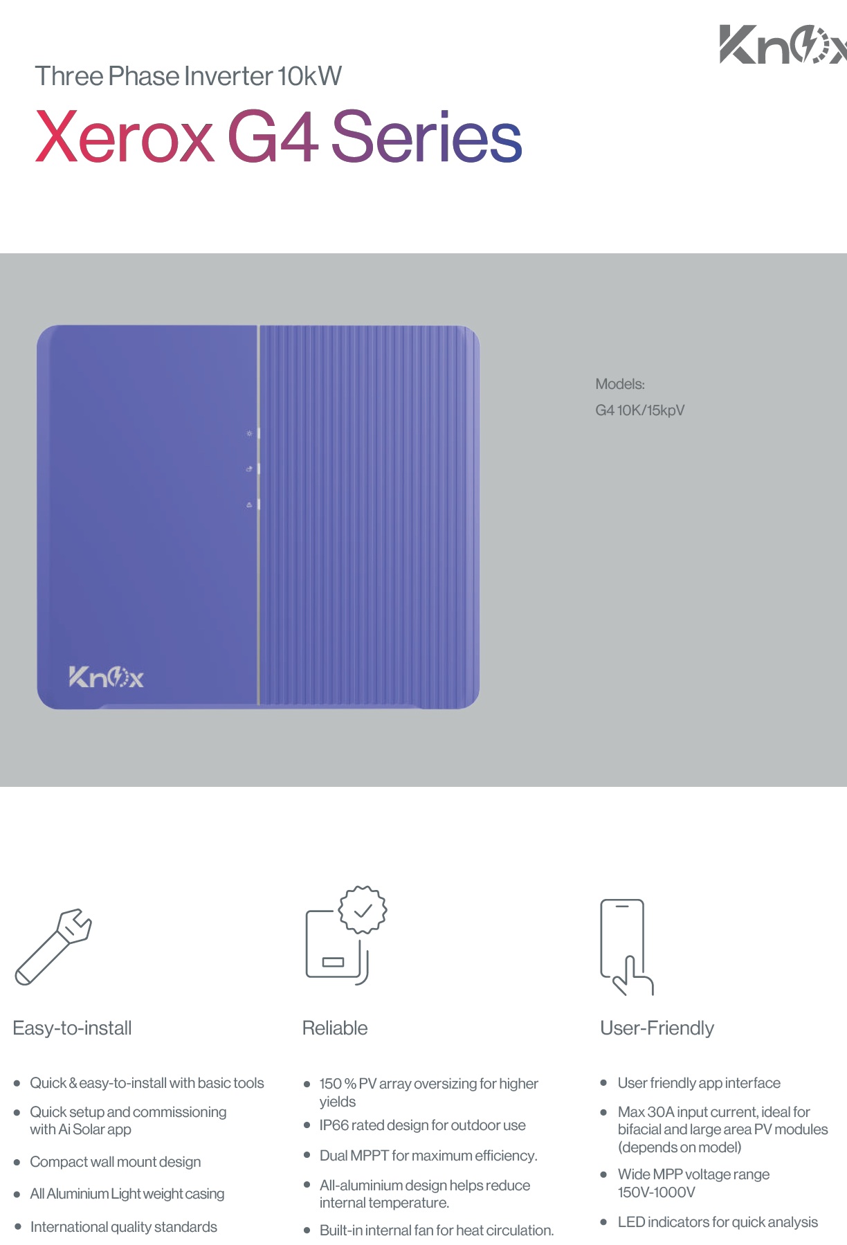 Xerox G4 Series 10kW Three Phase Solar Inverter with dual MPPT, IP66 outdoor protection, 150% PV oversizing, WiFi monitoring, and 98.6% efficiency. Ideal for commercial solar systems.